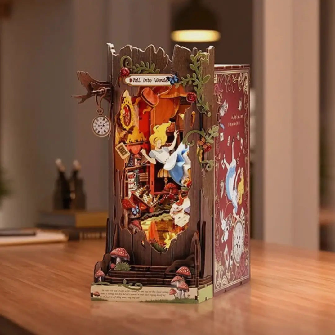 The wooden pieces in our Book Nooks are laser-cut with perfect precision, designed to snap together without needing glue. All our realistic dioramas come equipped with LED lighting that brings your miniature decoration to life, even at night. They create a cozy ambiance in your home and are particularly appreciated as reading night lights.