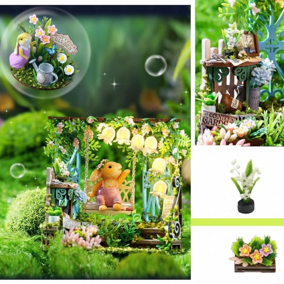 The Book Nook Fairytale Garden recreates a miniature garden worthy of a fairy tale, where you can see anthropomorphic rabbits: one swings on a swing in the middle of the garden while another picks flowers.
