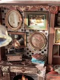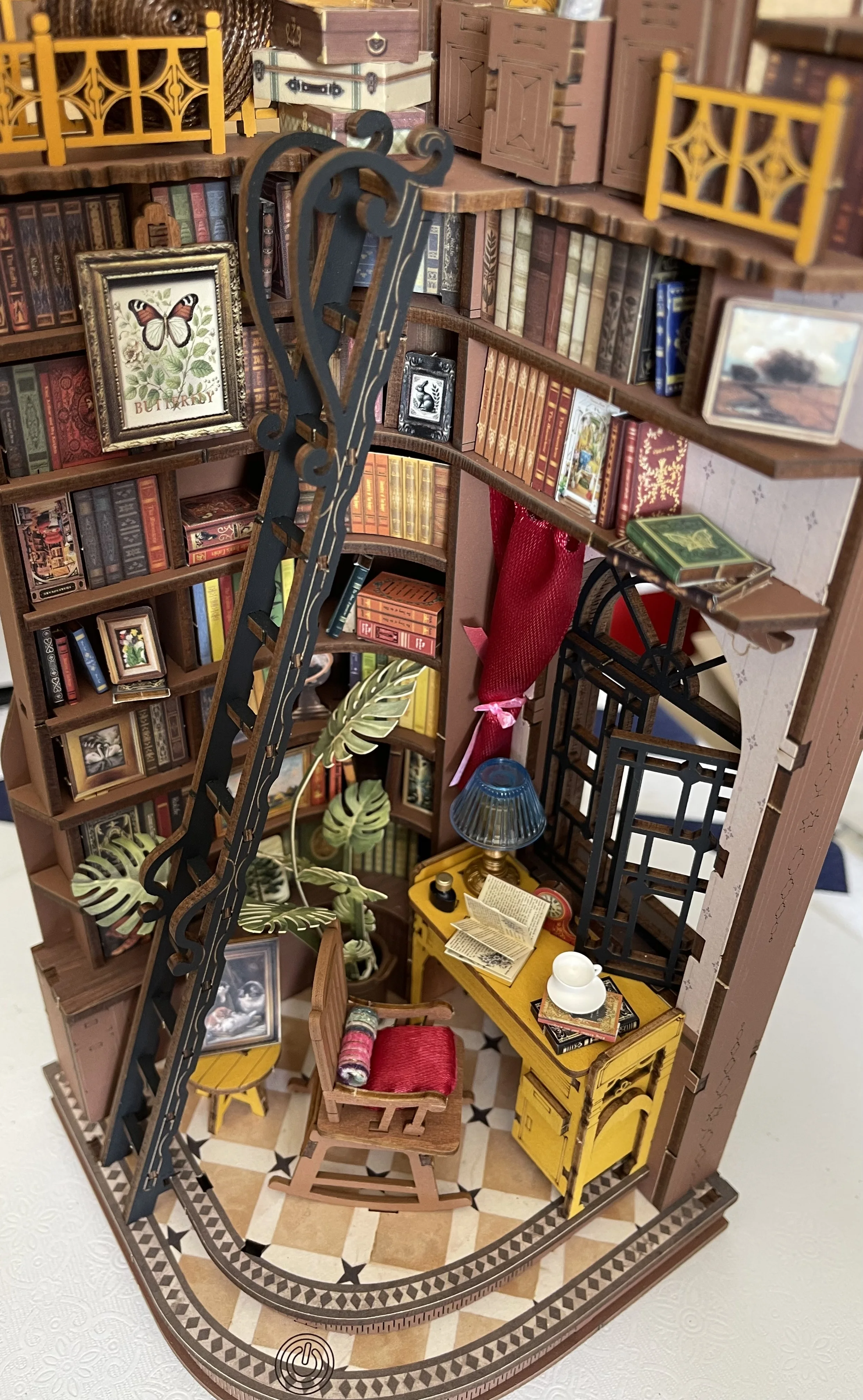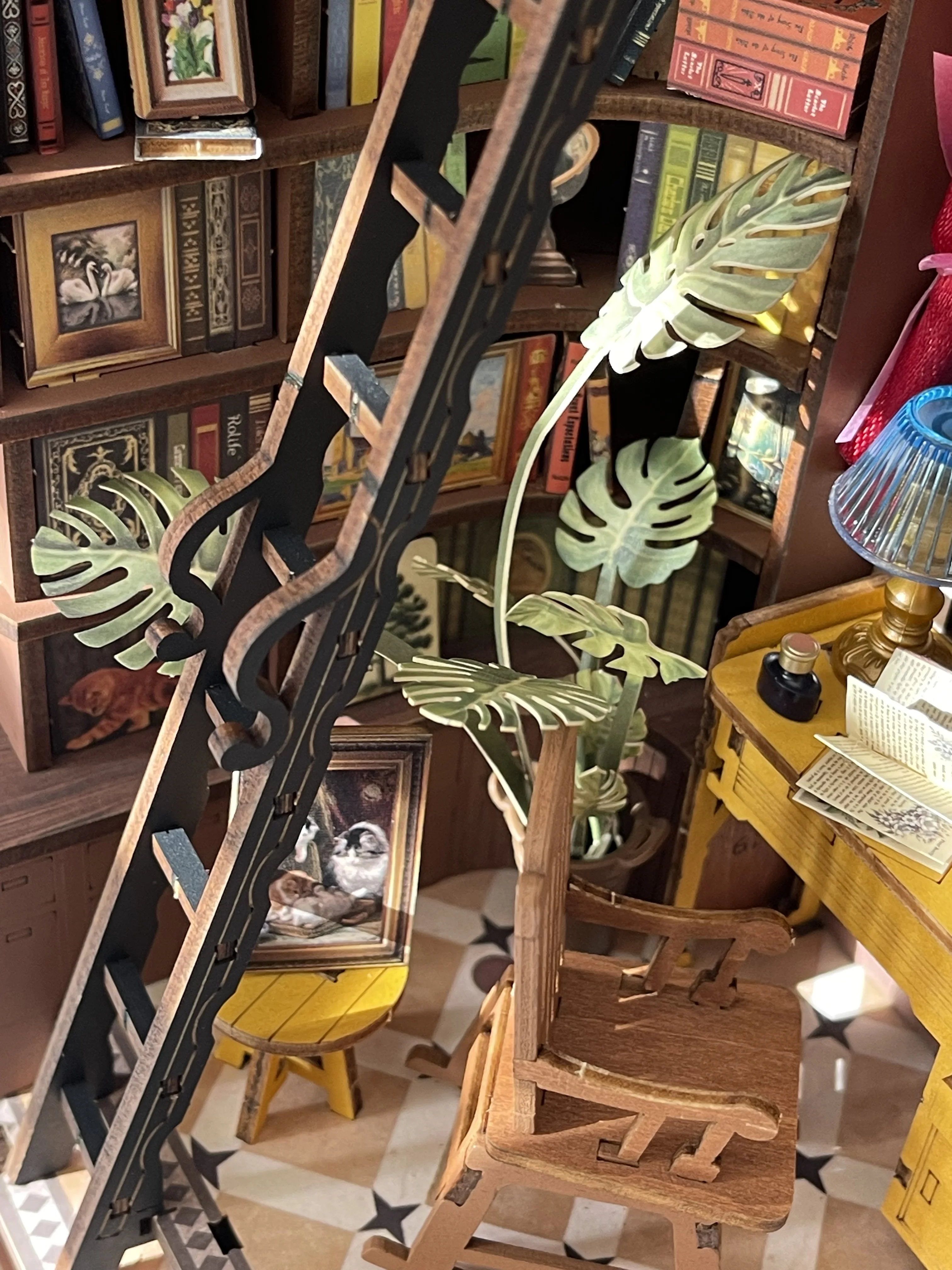 This miniature Book Nook recreates the warm atmosphere of a vintage British library. With an intimate reading corner with carved bookshelves filled with antique books, an elegant arched window, a comfortable rocking chair, a wooden desk, a ladder to reach the top shelves, and many refined accessories like a lamp, plants, a mysterious suitcase, and a teacup. Thanks to its touch-activated LED lighting, this diorama emits a soft amber glow that creates the perfect cozy ambiance for reading evenings.