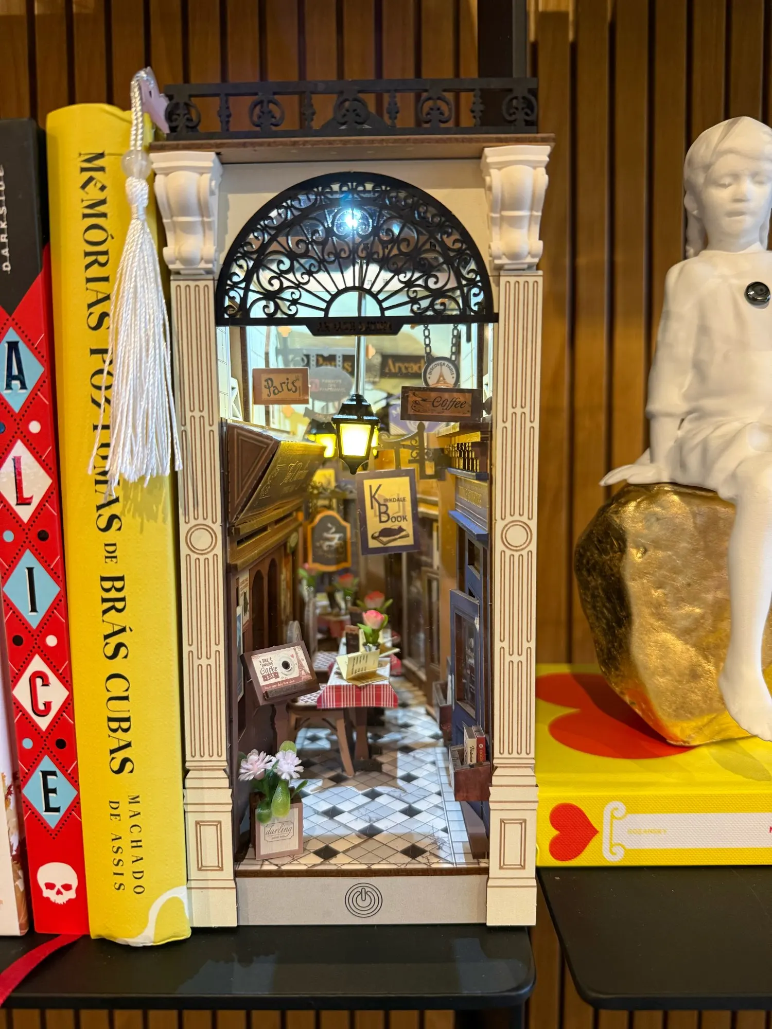 This miniature Book Nook recreates the romantic atmosphere of a traditional Parisian arcade where a bookstore and café blend together. With a multitude of details: a terrace with red-and-white checkered tables and chairs, potted plants, antique books, vintage French-style signs, and a magnificent wrought-iron arch topped with Roman columns. This Book Nook perfectly recreates the traditional ambiance of Parisian life.