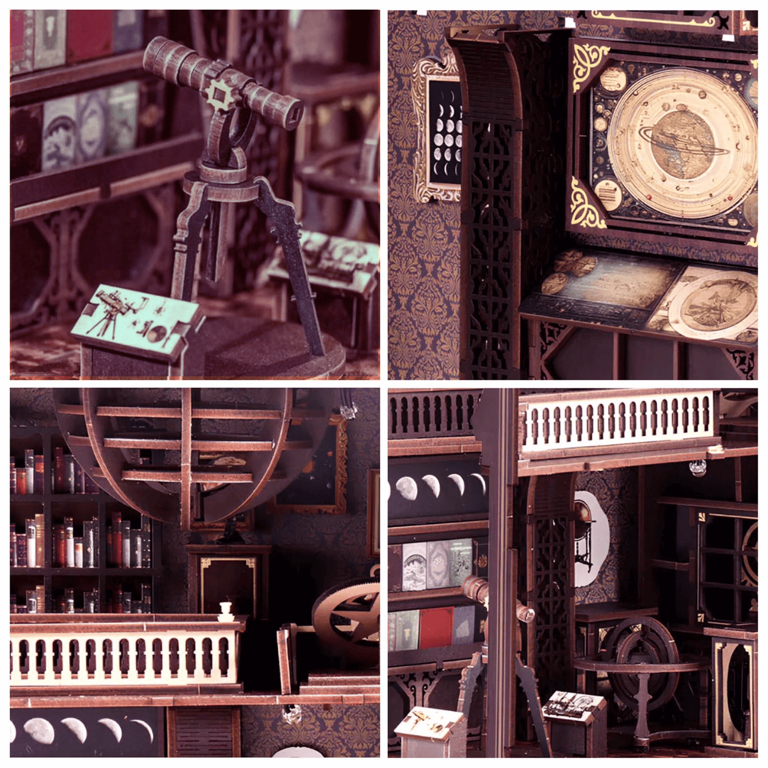 This Astronomy Museum Book Nook depicts an old astronomical observatory in a steampunk style. It features an 18th-century telescope, shelves filled with astronomy books, and star charts hanging on the walls.