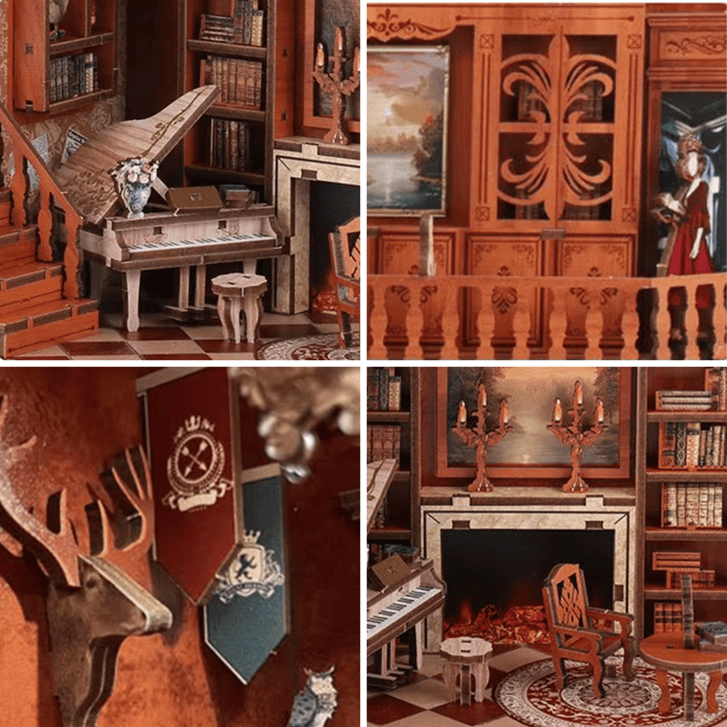 This Book Nook recreates the atmosphere of an old library inspired by the tales of the Brothers Grimm. It depicts a two-level structure showing a woman reading a book on the balcony and, below, the library and an elegant piano.
