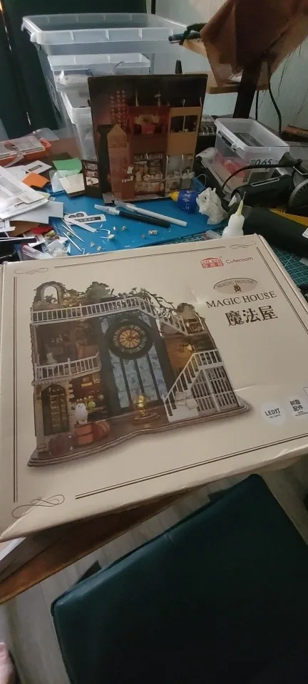 This Book Nook represents a miniature wizard's house on multiple floors. In this house, you'll find a large clock with colorful stained glass, a rooftop garden terrace in ruins with plants and a bubbling cauldron, a library filled with spellbooks, a white owl similar to Hedwig, flying brooms, travelers' suitcases, and many magical objects that immerse you in the world of Harry Potter and magic.